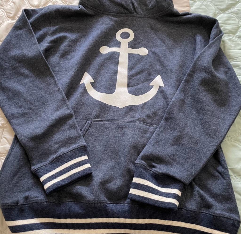 - Lapover hood with off-white drawcords