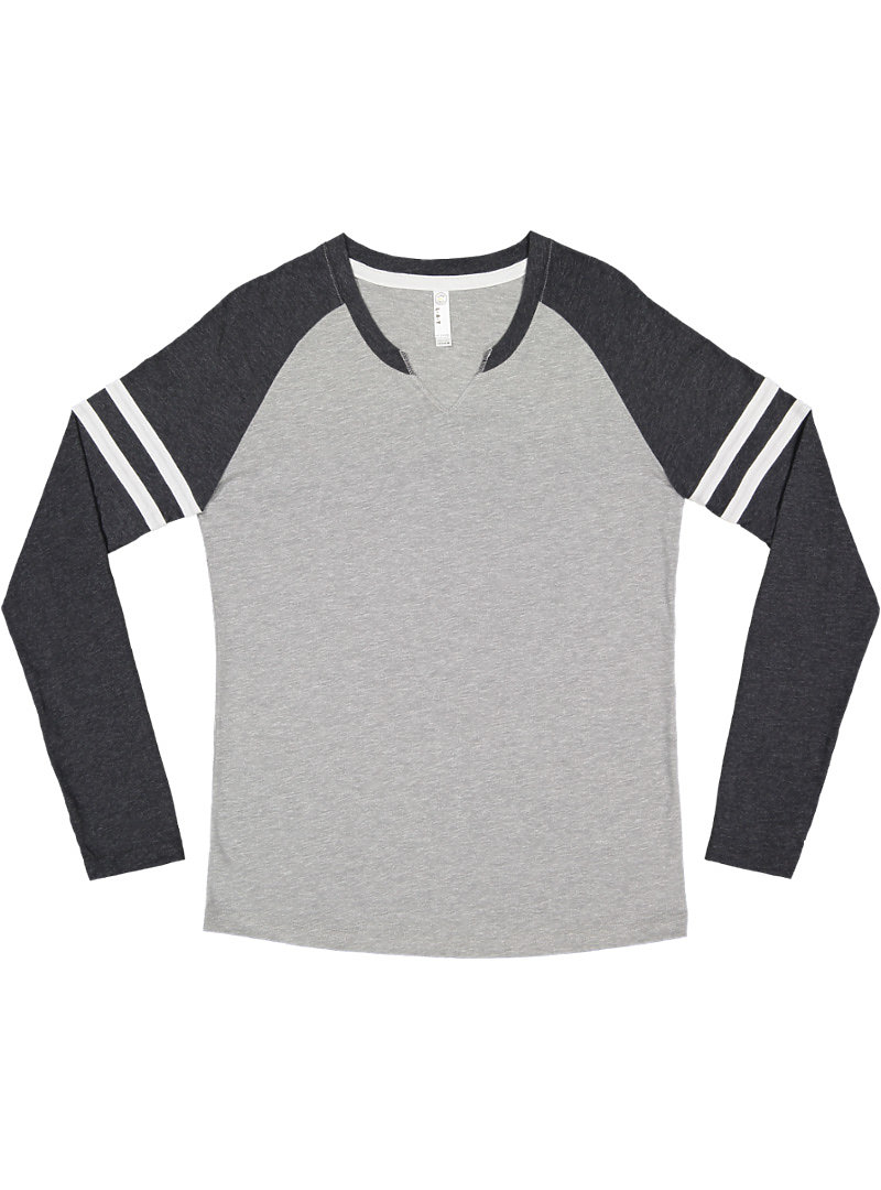 The LAT Ladies' Gameday Long Sleeve T-Shirt blends style and comfort. Crafted from a 60% cotton and 40% polyester fine jersey, this semi-fitted top features a V-notch with a raw serge finish, contrasting sleeve stripes, and a soft, rounded bottom hem. Available in 8 vibrant colors. Ideal for DTF Transfers and heat transfer vinyl, its fabric composition ensures vibrant and durable custom designs. Customers love its customization potential and comfy fit, optimal for team spirit wear.