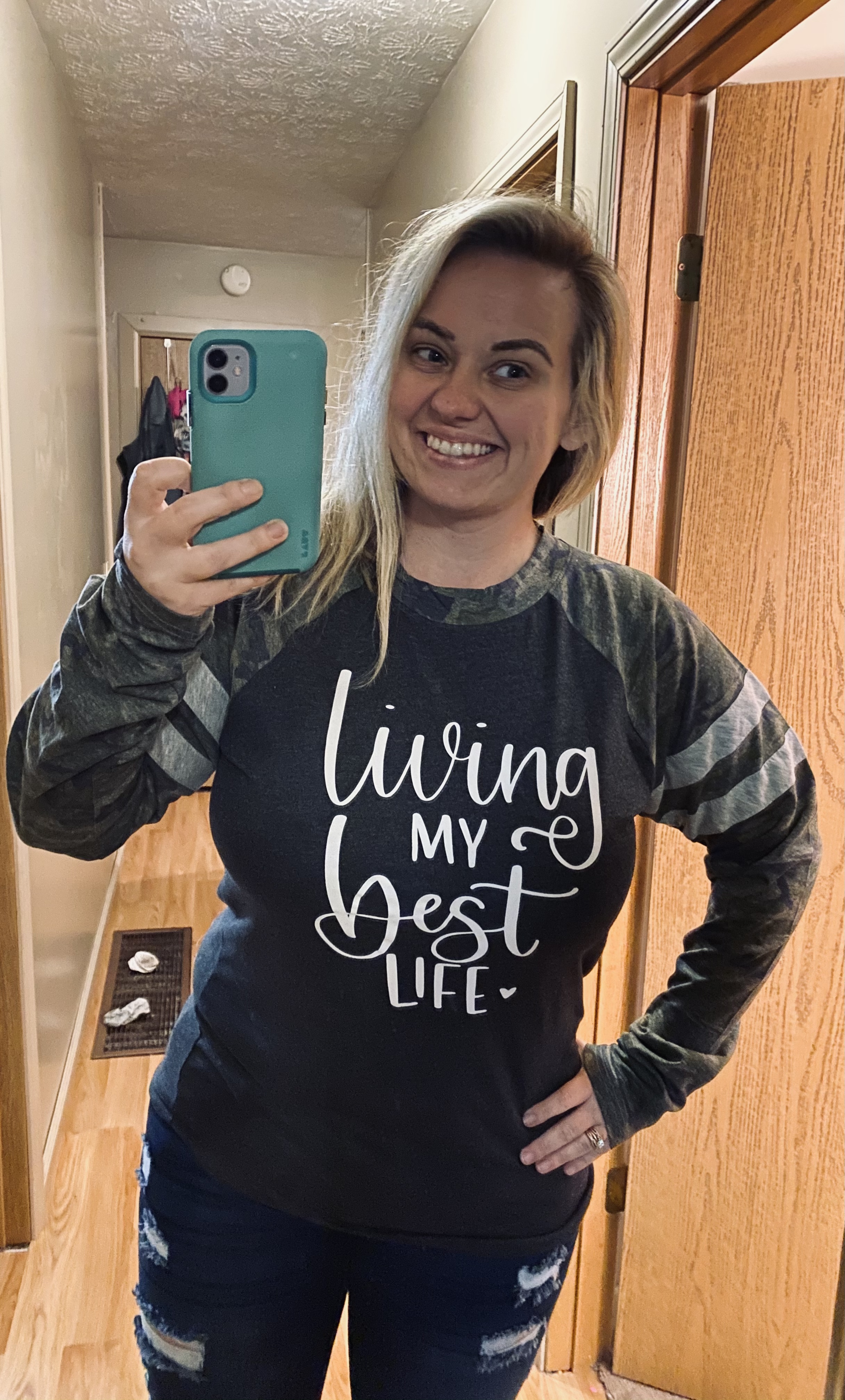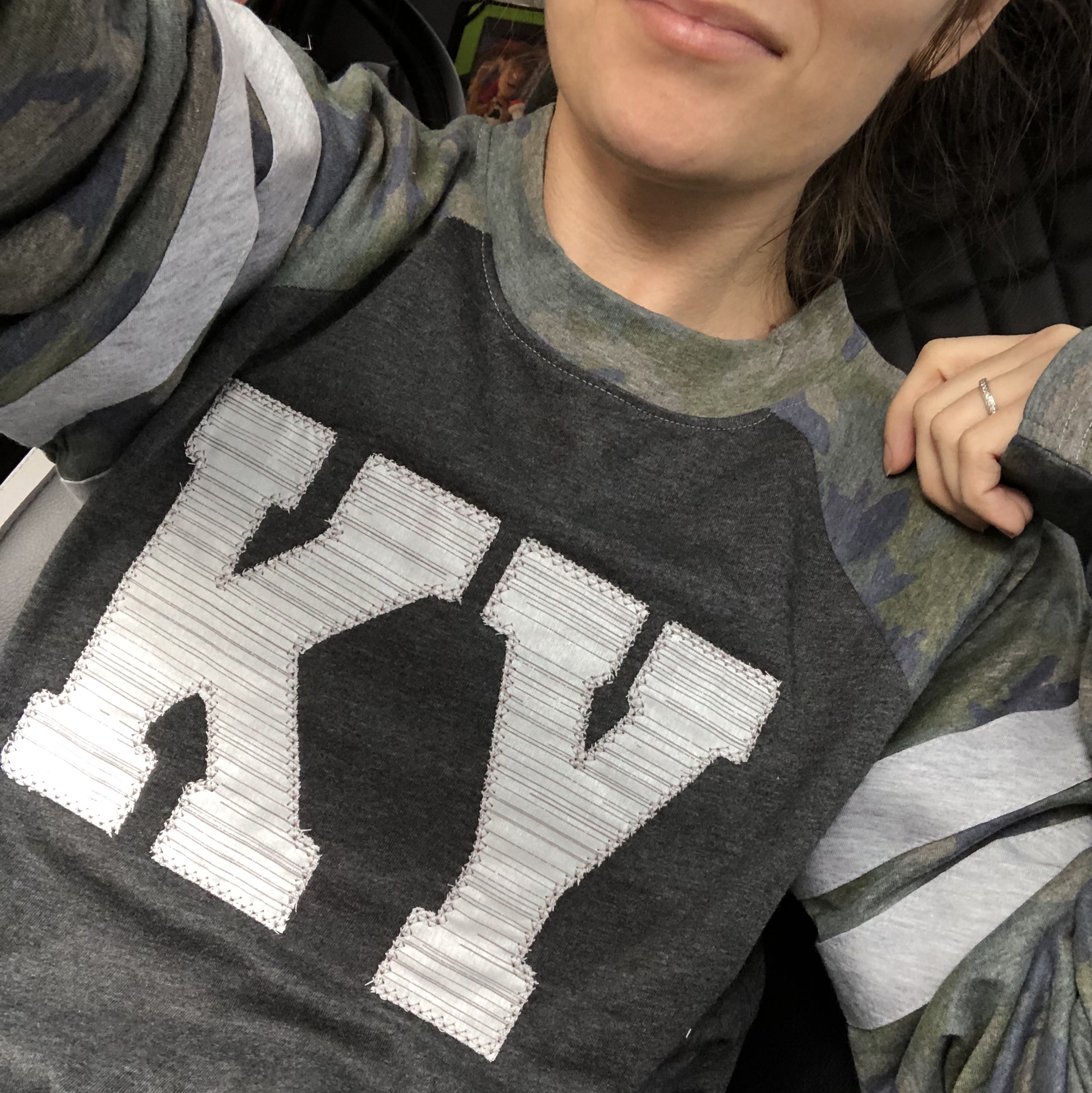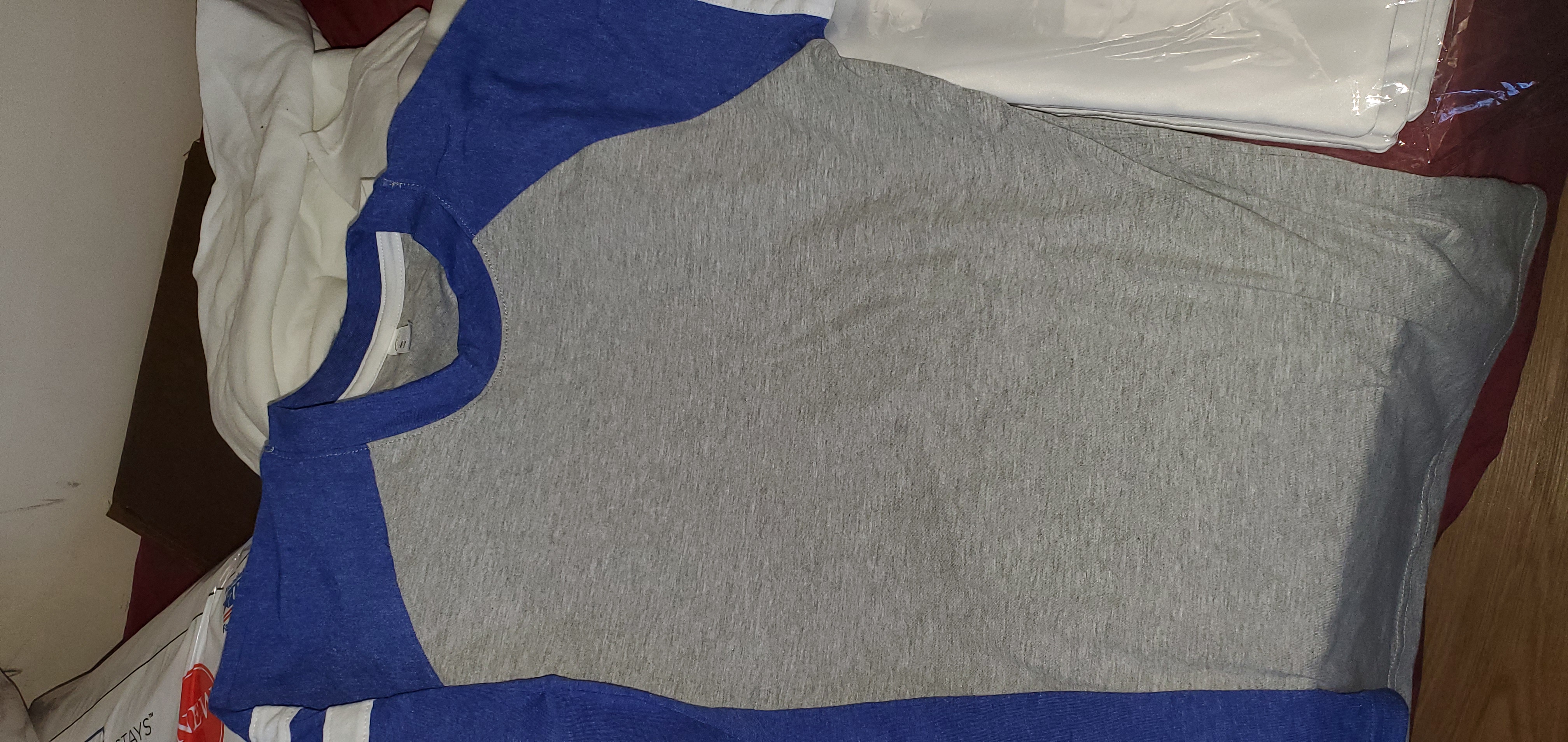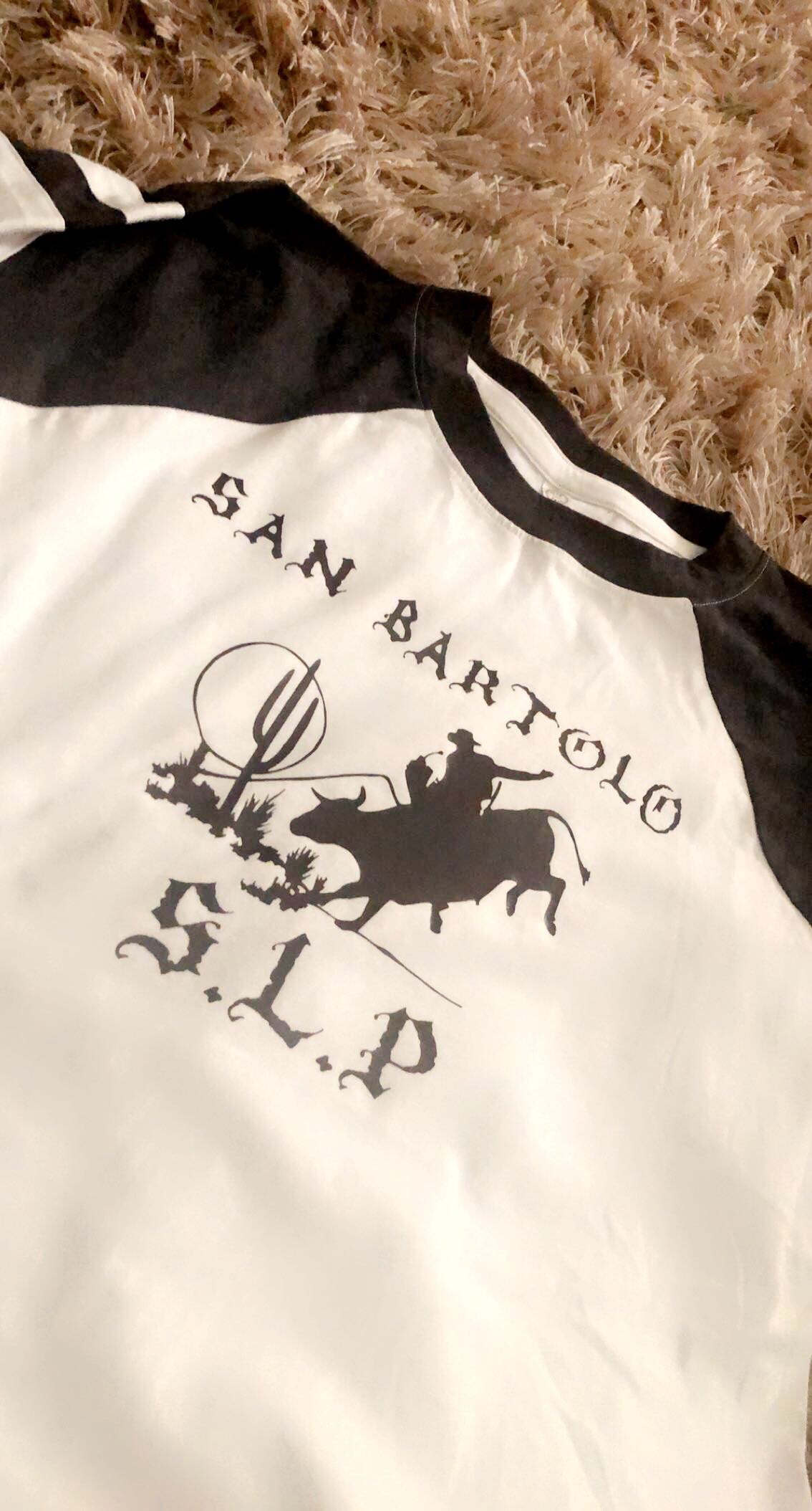 - Double-needle hemmed sleeves and rounded bottom