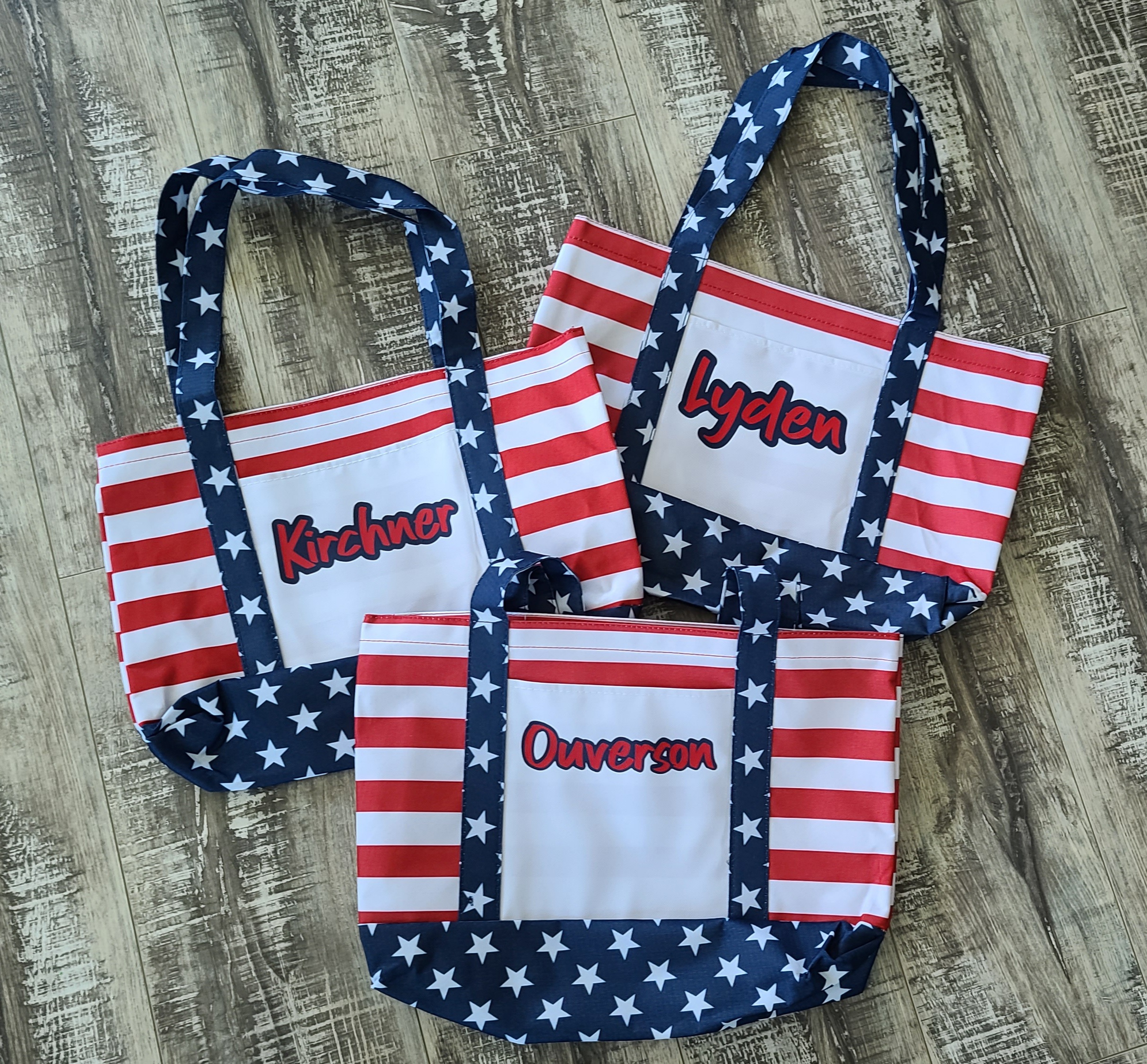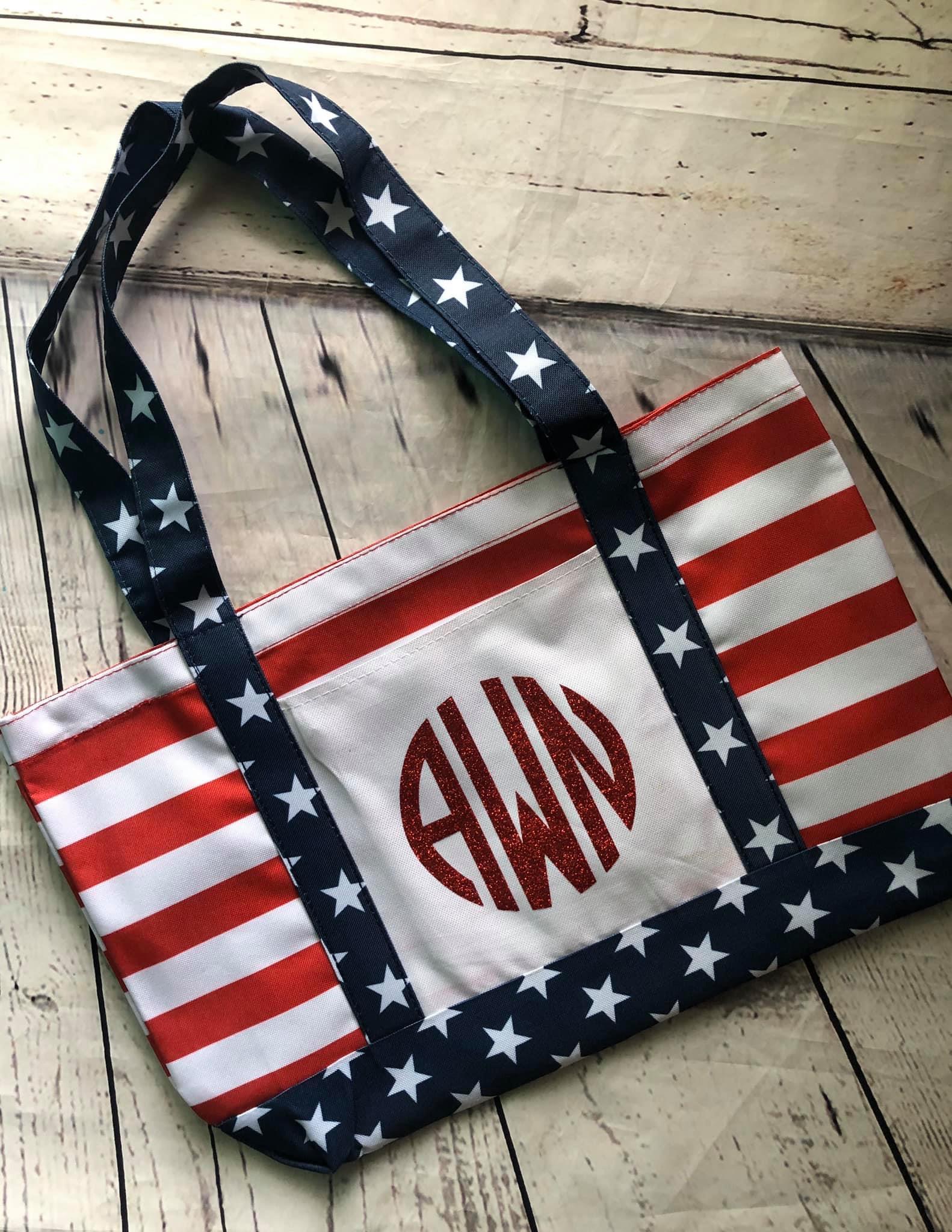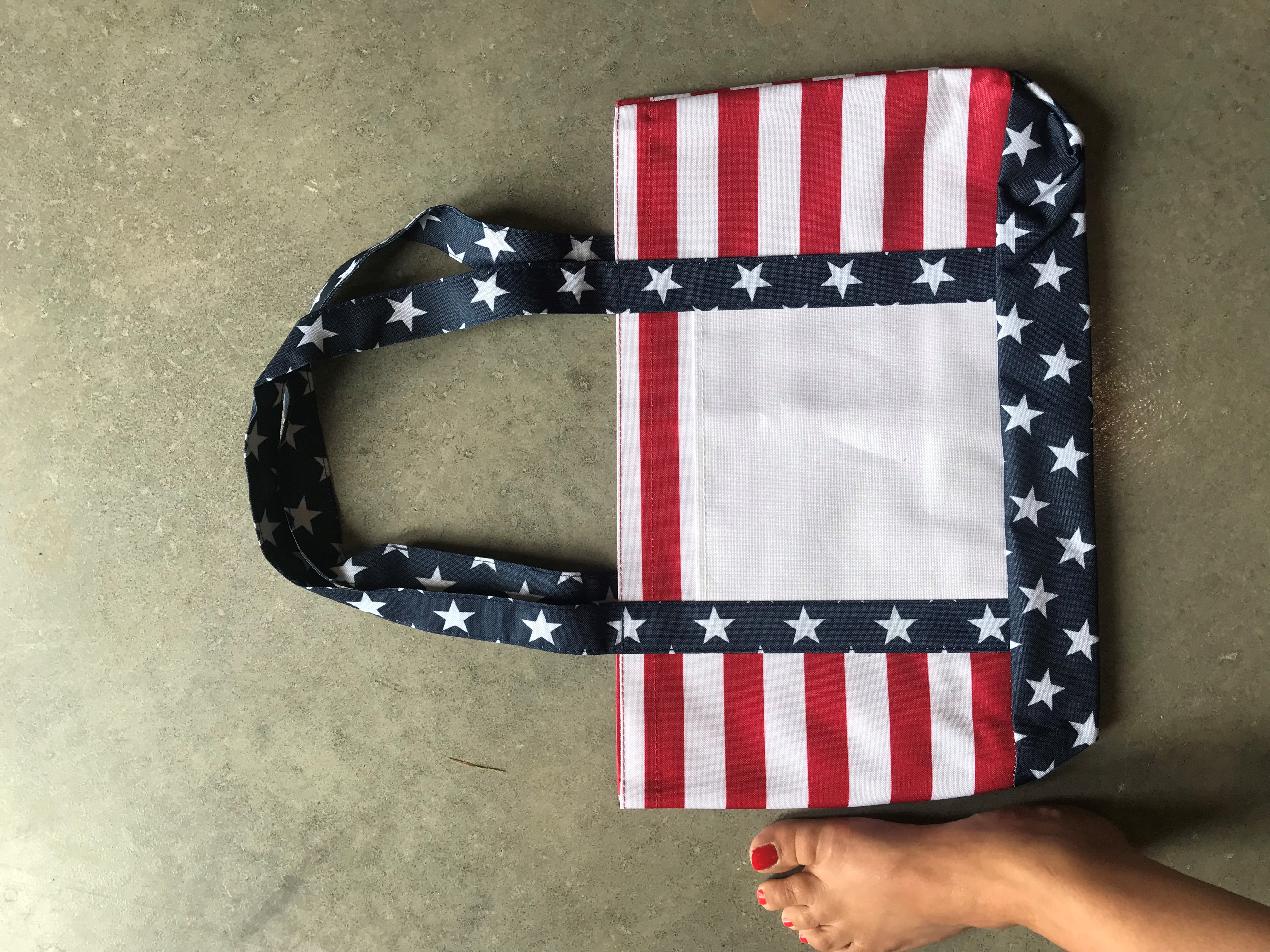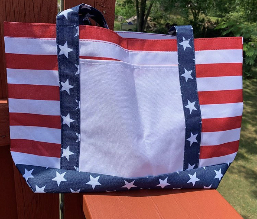 The OAD Americana Boater Tote offers patriotic flair with practical design. Crafted from durable 600D polyester, this tote features a vibrant stars and stripes pattern with a large white print area on the front pocket, optimal for customization. Available in red, white, and blue, it includes 23" handles and a 3 1/2" gusset for ample space. Ideal for vinyl and sublimation, the tote adapts well to various customization techniques. Customers appreciate its sturdy build and design versatility, though some note the finish could be improved.