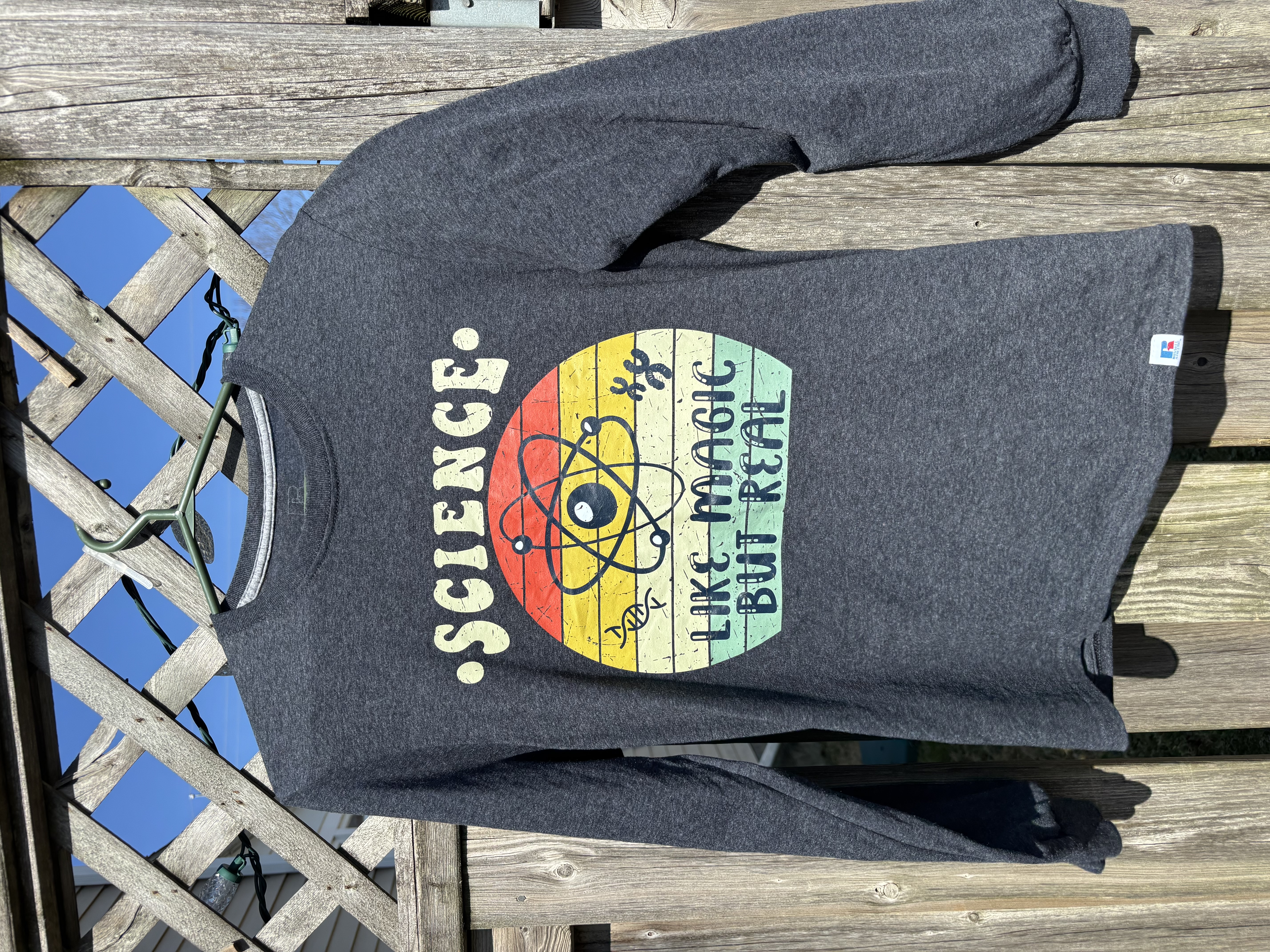 - Printed Russell patch on lower left hem